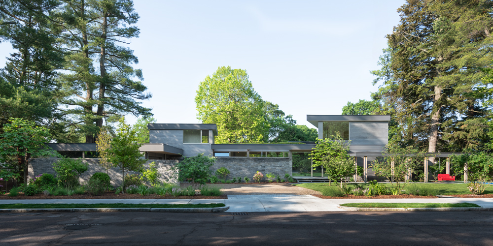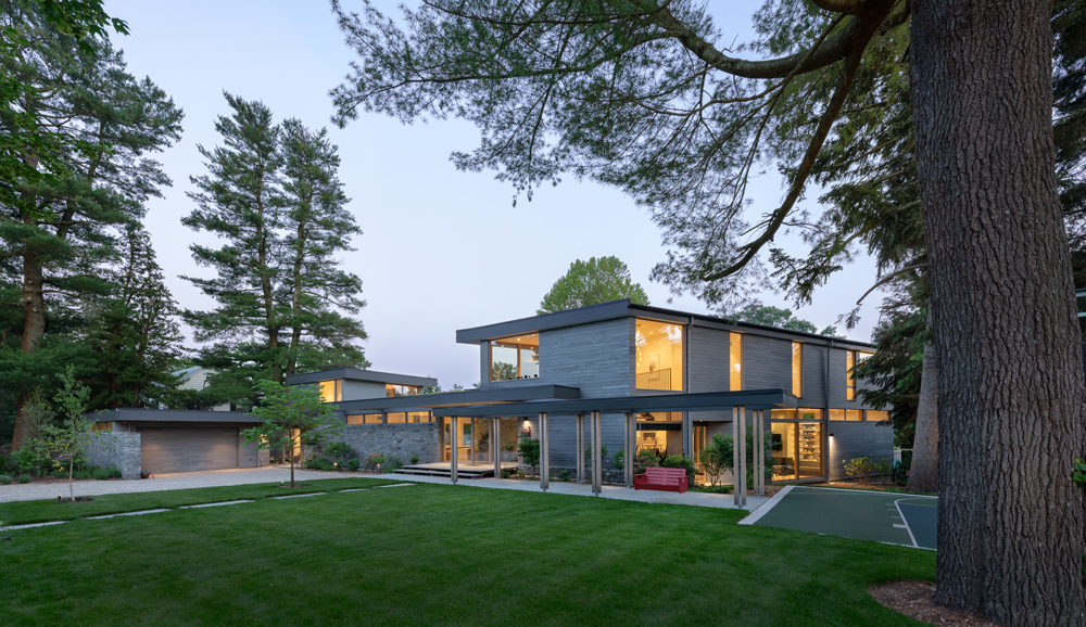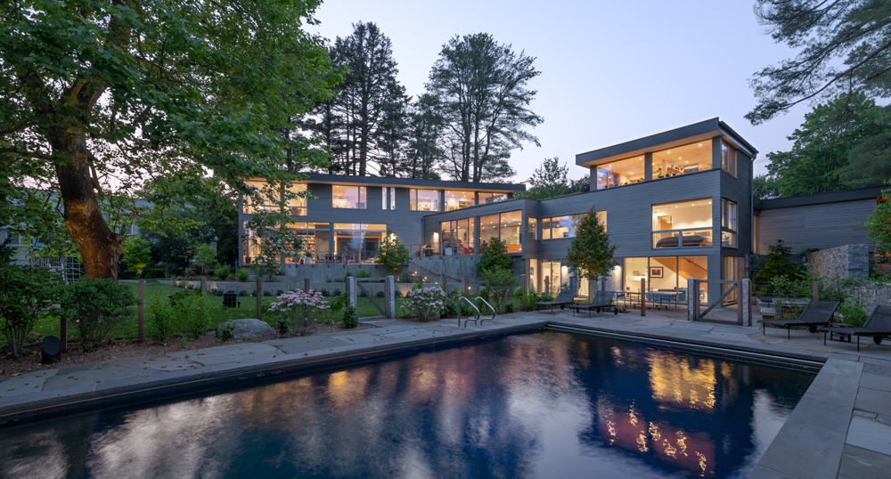 The Secret Garden House in Newton, MA is a serene retreat for a young family with a shared passion for sports and outdoors. The L-shaped design wraps around the pool and features ample exterior living spaces including a basketball court and elevated terraces for family and friends to gather.
