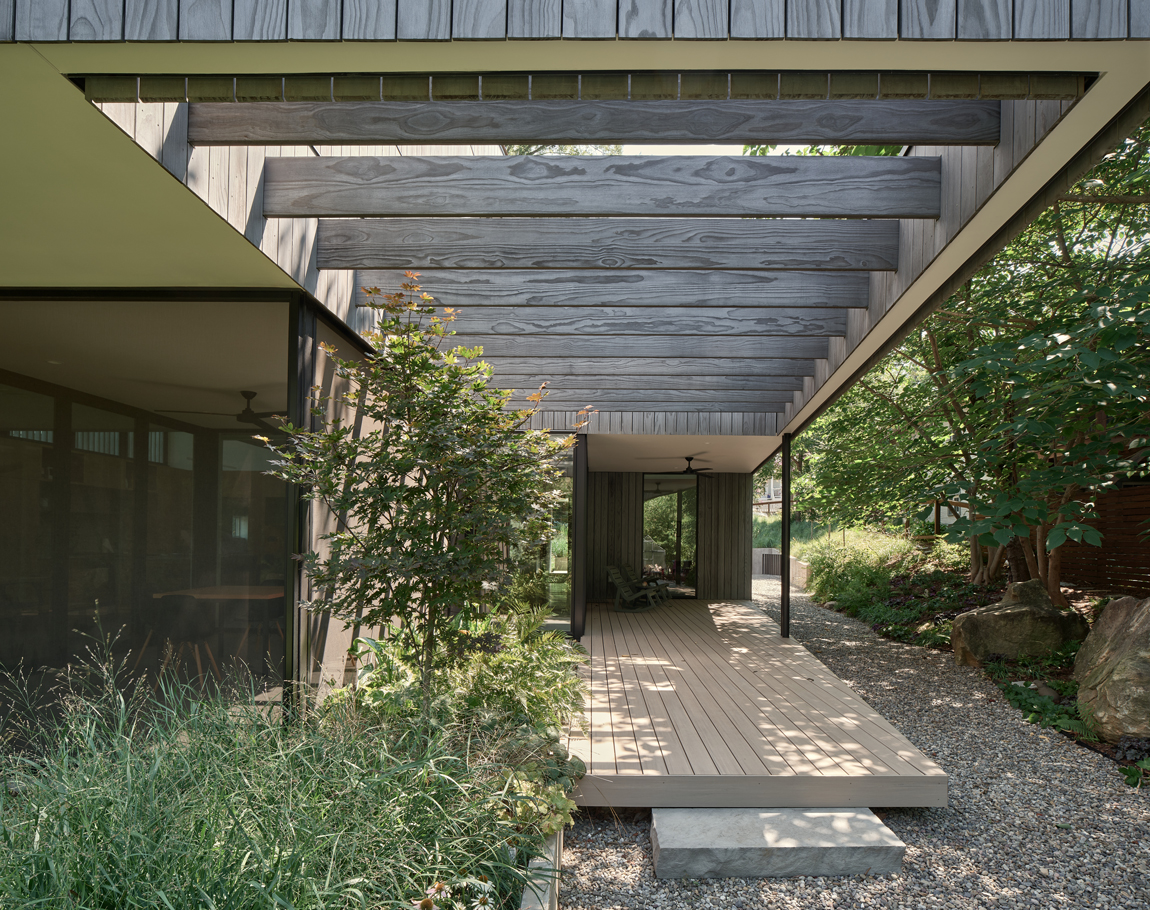 Charred NIGIRI cladding is integrated into vertical slats, providing privacy without limiting natural light across the home’s large central windows. Also used for the deck beams, the chemical modification of NIGIRI offers the durability and stability required for consistent performance in various outdoor conditions.