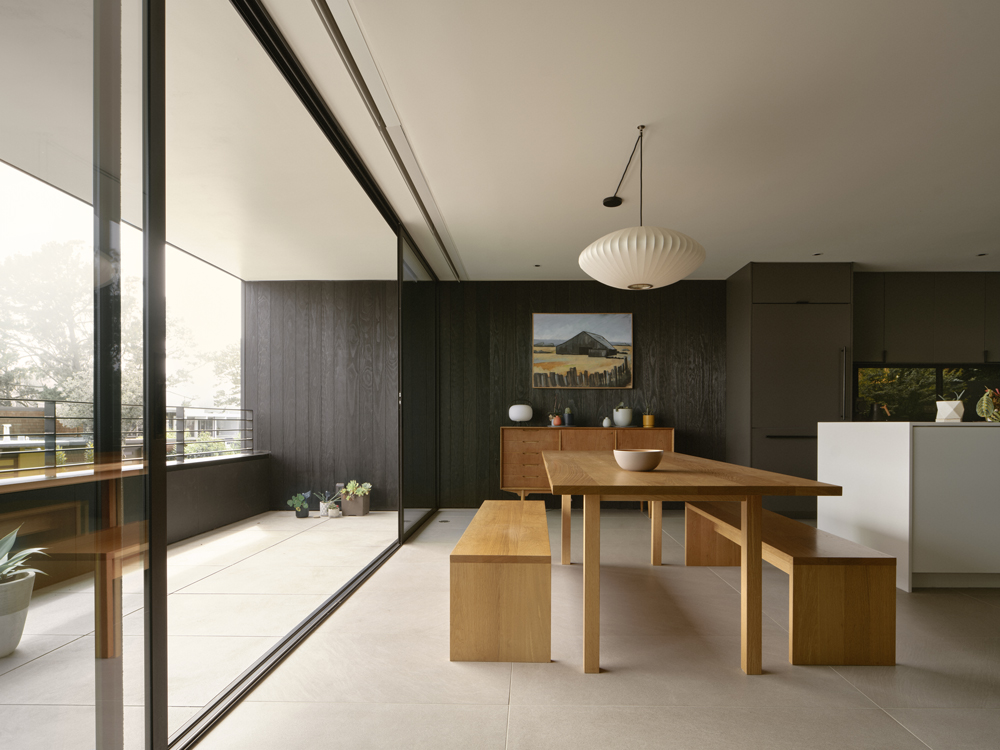 Up in the Clouds reinterprets the spirit of a 1962 Joseph Eichler home in San Francisco’s Diamond Heights. The remodel introduces a fourth-floor gathering room build-out, connected to the rest of the home and yard by a steel bridge. Inside, a simplified floor plan reshapes the interior to draw more natural light from the courtyard, strengthening the relationship between shared spaces and the surrounding landscape.