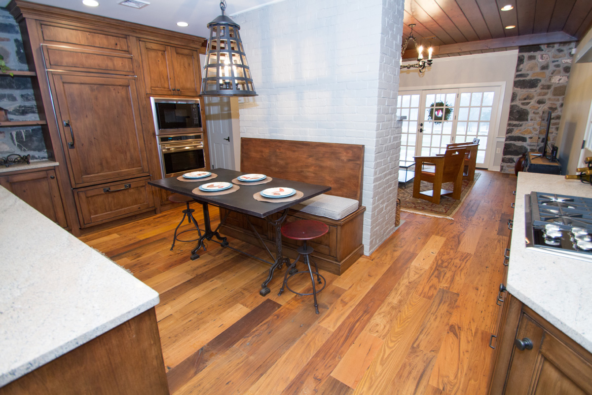 In historic UPPER MAKEFIELD township sits a sprawling farm, sprinkled with welcoming cottages, a renovated barn and a cozy main house. the nearly century-old buildings have been completely gutted, yet speak to the rich history of the area. Upper Makefield Township is memorialized as the turning point of the American Revolution at Washington Crossing Historic Park, aptly named for the Christmas evening George Washington led American forces across the Delaware River in 1776. Callaghan Interior Design, a PA-based firm with over 30 years of design experience, is leading this restoration project and specified several of reSAWN’s designs for flooring, wall cladding, and custom millwork: